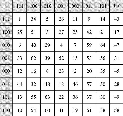 Resumindo, basta pegar um dos 64 números da tabela. Os 3 números correspondentes na coluna da esquerda são os primeiros dígitos, seguidos dos números correspondentes à linha de cima.